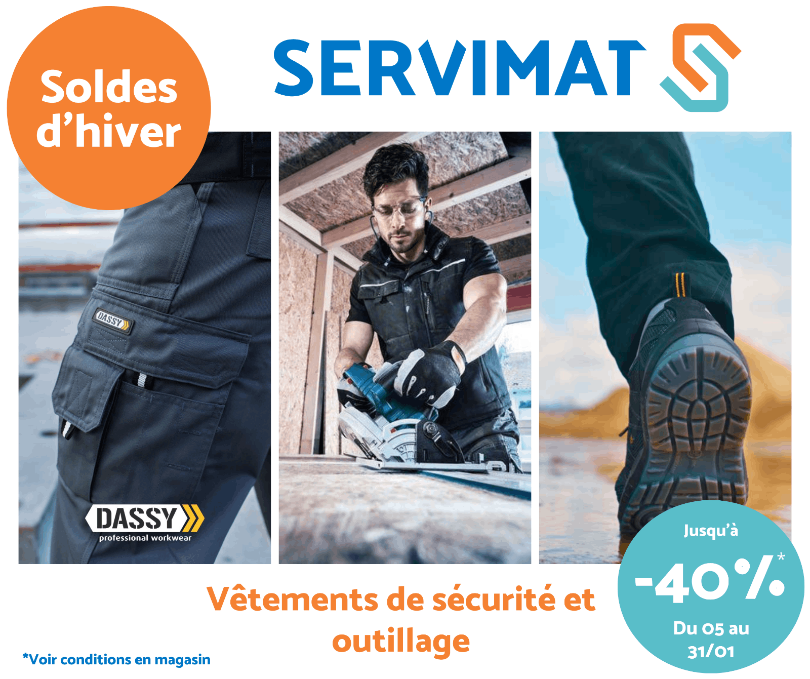 Du 5 au 31 janvier 2026, profitez des soldes d’hiver chez ServiMat et bénéficiez de jusqu’à – 40 % sur une sélection de vêtements de sécurité et d’outillage des plus grandes marques.